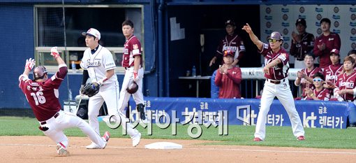 [아시아경제 김현민 기자]29일 서울 잠실구장에서 열린 프로야구 넥센 히어로즈와 두산 베어스의 경기, 4회초 넥센 선두타자 강정호가 우선 선상으로 흐르는 안타를 치고 2루베이스를 지나 3루를 향하고 있다.김현민 기자 kimhyun81@asiae.co.kr<ⓒ세계를 보는 창 경제를 보는 눈, 아시아경제(www.asiae.co.kr) 무단전재 배포금지>