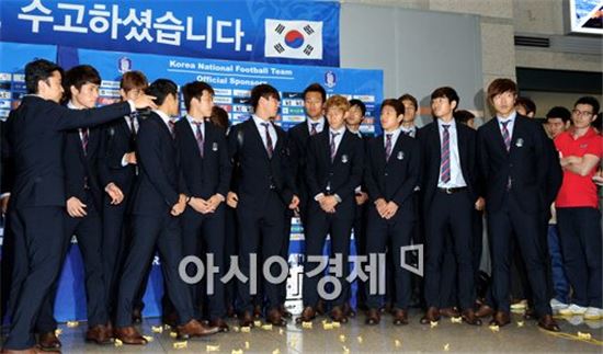 [영종도=아시아경제 김현민 기자] 2014 브라질 월드컵에서 조별리그 1무 2패로 16강 진출이 좌절된 축구 국가대표팀이 30일 인천국제공항을 통해 귀국했다. 입국장에서 열린 해단식 중 엿이 날아들자 선수단이 황급히 철수하고 있다.김현민 기자 kimhyun81@asiae.co.kr<ⓒ세계를 보는 창 경제를 보는 눈, 아시아경제(www.asiae.co.kr) 무단전재 배포금지>