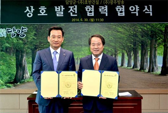 [최형식 담양군수와 김상열 호반건설·광주방송 회장(왼쪽)이 상호 발전을 위한 업무협약을 체결한 뒤 기념촬영을 하고 있다.]