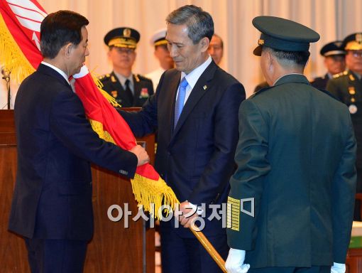 [아시아경제 최우창 기자]30일 서울 용산구 국방부에서 열린 제43·44대 국방부 장관 이·취임식에서 김관진 전 장관이 한민구 신임장관에게 지휘권의 상징인 국방기를 이양하고 있다. 최우창 기자 smicer@asiae.co.kr<ⓒ세계를 보는 창 경제를 보는 눈, 아시아경제(www.asiae.co.kr) 무단전재 배포금지>