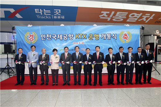 30일 인천공항 교통센터에서 KTX인천국제공항 운행 개통식이 열렸다. 이날 개통식에는 유정복 인천시장 당선자(왼쪽 다섯번째)를 비롯 여형구 국토교통부2차관(여섯번째), 최연혜 한국철도공사 사장(네번째), 강영일 철도시설공단 이사장(일곱번째) 등 관계자들이 다수 참석했다.