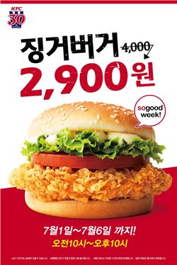 KFC가 6일 간 징거버거를 2900원에 할인 판매한다.