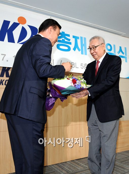 [아시아경제 김현민 기자] 김영기 KBL 신임 총재가 1일 서울 논현동 KBL 회관에서 열린 취임식에서 창원 LG 김진 감독으로부터 축가 꽃다발을 받고 있다. KBL 제3대 총재를 맡은 바 있는 김 총재는 국가대표로 활약한 경기인 출신으로 1956년 멜버른올림픽과 1964년 도쿄올림픽에 국가대표로 출전했고, 1984년 로스앤젤레스올림픽 한국 선수단 총감독을 역임하기도 했다. 또 김 총재는 대한농구협회 이사와 부회장, 대한체육회 부회장을 지냈다. 김 총재의 임기는 2017년 6월 30일까지다. 김현민 기자 kimhyun81@asiae.co.kr<ⓒ세계를 보는 창 경제를 보는 눈, 아시아경제(www.asiae.co.kr) 무단전재 배포금지>