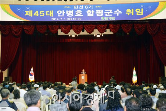 제45대 안병호 함평군수 취임식이 1일 오전 함평군농어민문화체육센터에서 군민과 공직자 등 500여 명이 참석한 가운데 열렸다. 안병호 함평군수가 취임사를 하고 있다.<br />