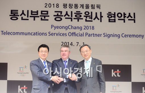 [아시아경제 백소아 기자] 1일 서울 세종로 광화문 올레스퀘어에서 열린 2018 평창동계올림픽 통신부문 공식후원사 협약식에서 (왼쪽부터)김진선 평창올림픽 위원장, 토마스 바흐 IOC 위원장, 황창규 KT회장이 기념사진 촬영을 하고 있다.백소아 기자 sharp2046@asiae.co.kr<ⓒ세계를 보는 창 경제를 보는 눈, 아시아경제(www.asiae.co.kr) 무단전재 배포금지>