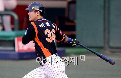 [아시아경제 김현민 기자] 1일 서울 목동구장에서 열린 프로야구 롯데 자이언츠와 넥센 히어로즈의 경기, 1회초 2사 1,3루에서 롯데 박종윤이 선취 1타점 적시타를 치고 있다. 김현민 기자 kimhyun81@asiae.co.kr<ⓒ세계를 보는 창 경제를 보는 눈, 아시아경제(www.asiae.co.kr) 무단전재 배포금지>