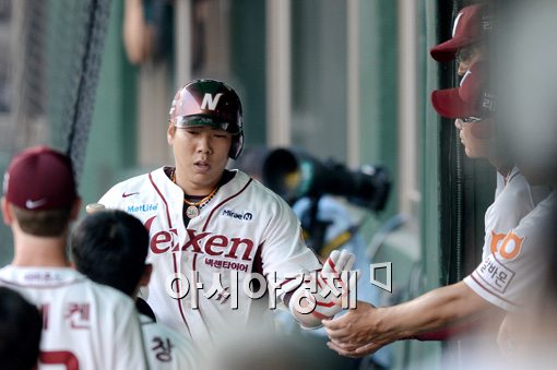 [아시아경제 김현민 기자] 1일 서울 목동구장에서 열린 프로야구 롯데 자이언츠와 넥센 히어로즈의 경기, 2회말 넥센 선두타자 강정호가 동점 우월 솔로홈런을 치고 동료들의 열렬한 환영을 받고 있다. 김현민 기자 kimhyun81@asiae.co.kr<ⓒ세계를 보는 창 경제를 보는 눈, 아시아경제(www.asiae.co.kr) 무단전재 배포금지>