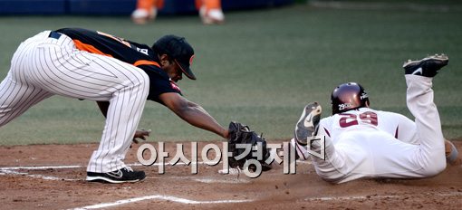 [아시아경제 김현민 기자] 1일 서울 목동구장에서 열린 프로야구 롯데 자이언츠와 넥센 히어로즈의 경기, 3회말 무사 1,2루에서 넥센 강정호 타석 때 2루주자 이택근이 롯데 유먼의 폭투를 틈타 홈으로 쇄도해 세이프되고 있다. 김현민 기자 kimhyun81@asiae.co.kr<ⓒ세계를 보는 창 경제를 보는 눈, 아시아경제(www.asiae.co.kr) 무단전재 배포금지>