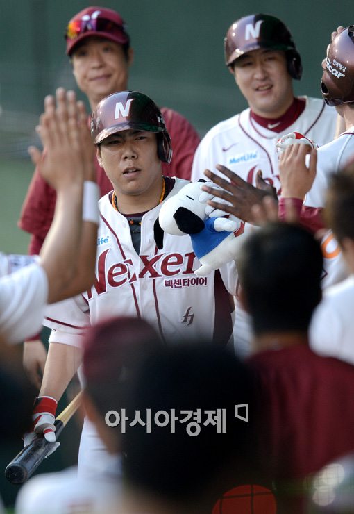[아시아경제 김현민 기자] 1일 서울 목동구장에서 열린 프로야구 롯데 자이언츠와 넥센 히어로즈의 경기, 3회말 1사 3루에서 넥센 강정호가 롯데 유먼을 상대로 좌중간 투런홈런을 치고 동료들의 환영을 받고 있다. 김현민 기자 kimhyun81@asiae.co.kr<ⓒ세계를 보는 창 경제를 보는 눈, 아시아경제(www.asiae.co.kr) 무단전재 배포금지>