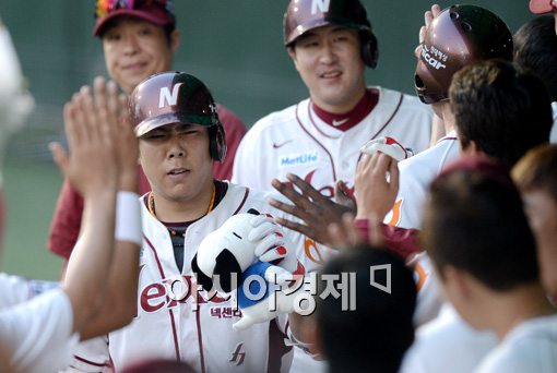 [아시아경제 김현민 기자] 1일 서울 목동구장에서 열린 프로야구 롯데 자이언츠와 넥센 히어로즈의 경기, 3회말 1사 3루에서 넥센 강정호가 롯데 유먼을 상대로 좌중간 투런홈런을 치고 동료들의 환영을 받고 있다. 김현민 기자 kimhyun81@asiae.co.kr<ⓒ세계를 보는 창 경제를 보는 눈, 아시아경제(www.asiae.co.kr) 무단전재 배포금지>