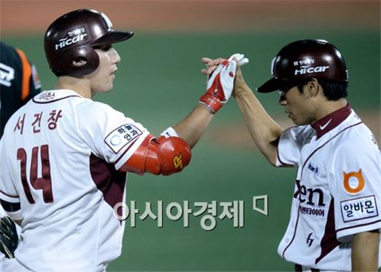 [아시아경제 김현민 기자] 1일 서울 목동구장에서 열린 프로야구 롯데 자이언츠와 넥센 히어로즈의 경기, 7회말 무사 1루에서 넥센 서건창이 추가 1타점 3루타를 치고 기뻐하고 있다. 김현민 기자 kimhyun81@asiae.co.kr<ⓒ세계를 보는 창 경제를 보는 눈, 아시아경제(www.asiae.co.kr) 무단전재 배포금지>