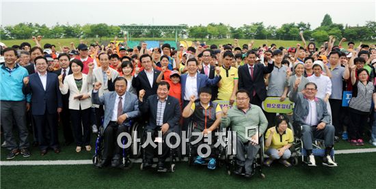 윤장현 광주광역시장이 2일 상무시민공원 운동장에서 열린 ‘2014근로장애인 어울림 체육대회’에 참석해 근로자들과 기념촬영을 하면서 파이팅을 외치고있다. 사진제공=광주시