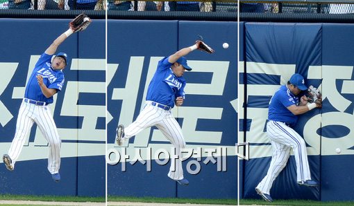 [아시아경제 김현민 기자] 4일 오후 서울 잠실구장에서 열린 프로야구 삼성 라이온즈와 두산 베어스의 경기, 삼성 우익수 박한이가 1회말 두산 선두타자 민병헌의 타구를 놓치고 있다. 김현민 기자 kimhyun81@asiae.co.kr<ⓒ세계를 보는 창 경제를 보는 눈, 아시아경제(www.asiae.co.kr) 무단전재 배포금지>