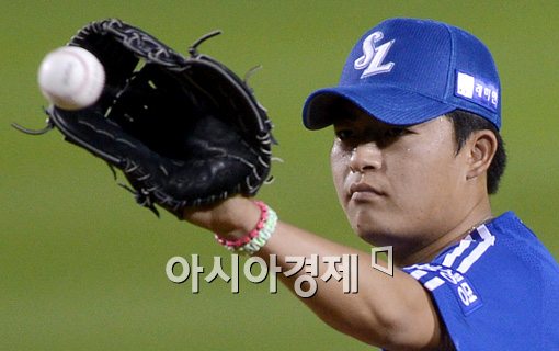 [아시아경제 김현민 기자] 4일 오후 서울 잠실구장에서 열린 프로야구 삼성 라이온즈와 두산 베어스의 경기, 7회말 삼성 구원투수 심창민이 마운드에 올라 볼을 건네받고 있다. 김현민 기자 kimhyun81@asiae.co.kr<ⓒ세계를 보는 창 경제를 보는 눈, 아시아경제(www.asiae.co.kr) 무단전재 배포금지>