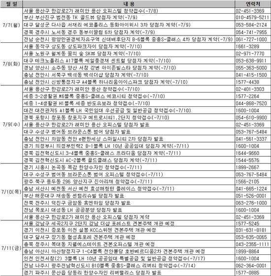 [아시아경제 이민찬 기자]부동산 시장 비수기인 7월에도 전국에서 알짜 분양 물량이 쏟아지고 있다.부동산정보업체 부동산써브(www.serve.co.kr)에 따르면 7월 둘째 주 부동산 시장에는 청약접수 13곳, 당첨자 발표 8곳, 당첨자 계약 14곳, 견본주택 개관 5곳 등이 예정돼 있다.7일 삼성물산이 서울 용산구 한강로2가 342 일대에 공급하는 '래미안 용산' 오피스텔의 청약접수를 진행한다. 오피스텔은 전용면적 42~84㎡ 총 782실 중 597실을 일반분양 한다. 서울지하철 1호선·중앙선 용산역, 4호선 신용산역 사이에 위치해 있고 강변북로 등도 쉽게 이용할 수 있다. 단지 인근에 용산가족공원, 한강시민공원, 국립중앙박물관 등의 편의시설을 이용할 수 있다. 10일 효성이 충남 서산시 예천동 434-1 일대에 공급하는 '서산 예천 효성해링턴 플레이스' 청약접수를 진행한다. 지하 2~지상 22층 9개 동, 전용면적 59~84㎡ 총 808가구로 구성된다. 서해로, 충의로 등을 이용할 수 있다. 예천초, 서산중, 서산여중, 석림중, 서산여고, 서산중앙고 등의 교육시설도 인접해 있다. 11일 포스코건설이 서울 강남구 세곡2지구 2단지에 공급하는 '강남 더샵 포레스트'의 견본주택을 개관할 예정이다. 지하 3~지상 12층 10개 동, 전용면적 114~244㎡ 총 400가구로 구성된다. 분당~수서 간 고속도로, 분당~내곡 간 고속도로, 동부간선도로, 서울외곽순환도로 등을 쉽게 이용할 수 있다. 단지 인근에 가락농수산물종합도매시장, 가든파이브, 삼성서울병원, 대모산, 탄천 등의 편의시설을 이용할 수 있다.같은 날 KCC건설이 경기 이천시 증포동 372 일대에 공급하는 '이천 설봉 KCC'의 견본주택을 개관할 예정이다. 지하 1~지상 20층 10개 동, 전용면적 59~84㎡ 총 562가구로 구성된다. 이섭대천로를 이용해 시내로 쉽게 이동할 수 있고 성남~여주 복선전철과 부발~충주~문경 중부내륙전철 등 교통망 확충도 예정돼 있다.이민찬 기자 leemin@asiae.co.kr<ⓒ세계를 보는 창 경제를 보는 눈, 아시아경제(www.asiae.co.kr) 무단전재 배포금지>