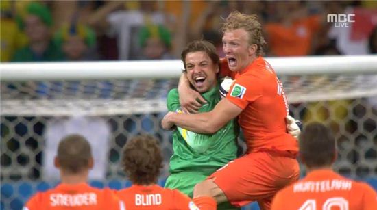 ▲네덜란드 키퍼 팀 크롤(초록색)이 승부차기 끝에 거머쥔 우승에 기뻐하고 있다. (사진:MBC 중계방송 캡처)