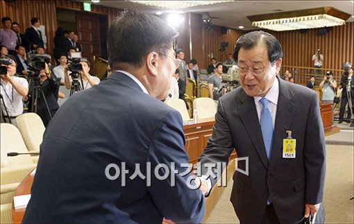 [아시아경제 윤동주 기자] 이병기 국정원장 후보자(오른쪽)가 7일 서울 여의도 국회에서 열린 인사청문회에 출석해 김광림 위원장과 인사를 나누고 있다.윤동주 기자 doso7@asiae.co.kr<ⓒ세계를 보는 창 경제를 보는 눈, 아시아경제(www.asiae.co.kr) 무단전재 배포금지>