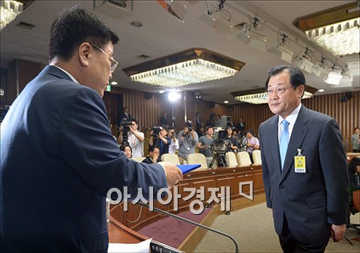 [아시아경제 윤동주 기자] 이병기 국정원장 후보자가 7일 서울 여의도 국회에서 열린 인사청문회에 출석해 김광림 위원장에게 선언문을 전달하고 있다.윤동주 기자 doso7@asiae.co.kr<ⓒ세계를 보는 창 경제를 보는 눈, 아시아경제(www.asiae.co.kr) 무단전재 배포금지>