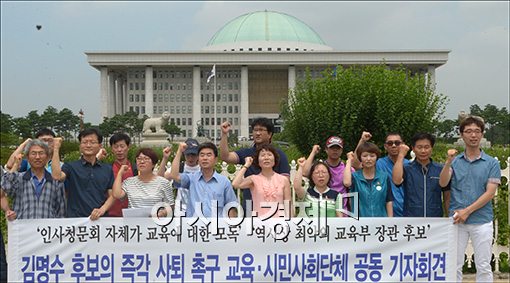 [아시아경제 윤동주 기자] 김명수 사회부총리 겸 교육부 장관 후보자에 대한 인사청문회가 실시되고 있는 9일 서울 여의도 국회 정문앞에서 교육관련 시민단체 회원들이 김 후보자 사퇴를 촉구하는 기자회견을 갖고 있다.윤동주 기자 doso7@asiae.co.kr<ⓒ세계를 보는 창 경제를 보는 눈, 아시아경제(www.asiae.co.kr) 무단전재 배포금지>
