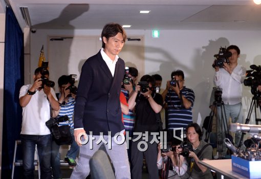 [포토]사퇴 기자회견장 들어서는 홍명보 감독