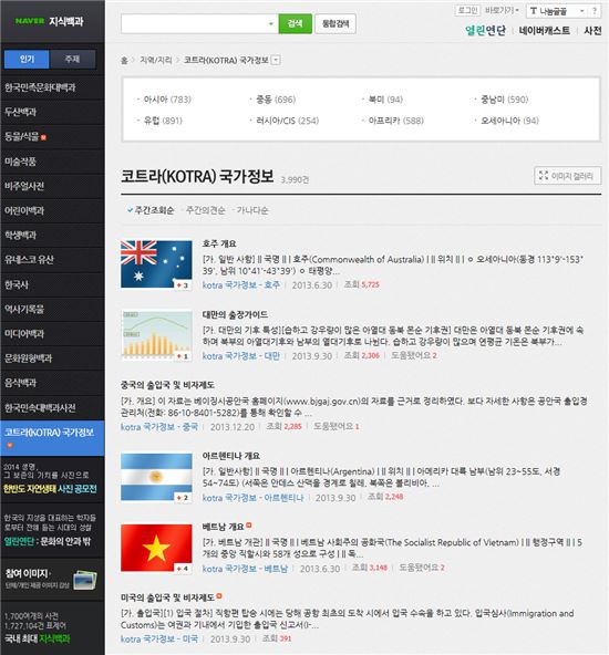 [아시아경제 김영식 기자]네이버는 KOTRA(대한무역투자진흥공사)와 제휴를 맺고 네이버 지식백과를 통해 해외 무역, 투자관련 정보를 제공한다고 10일 밝혔다. 앞으로 네이버 지식백과에서는 각 나라의 정치, 사회 등 일반 정보와 지리, 지형정보 등과 더불어 해외 93개 국가들의 무역, 투자와 관련된 전문정보도 함께 확인할 수 있다. 특히 KOTRA에서 제공하는 전문정보를 통해 아시아, 유럽, 아프리카 등 대륙 별로 분류된 93개 국가들의 수입규제제도와 관세제도, 조세제도 등 해외 비즈니스 과정에서 도움을 받을 수 있는 상세정보들을 확인할 수 있다. 나라별 출장가이드, 비즈니스 에티켓, 상관습 및 거래시 유의사항 등 문화적 특성과 관련된 정보들도 제공된다.네이버는 “최근 대한지리학회 등과 손을 잡고 ‘세계지명사전’을 통해 남아메리카 지역의 도시 정보를 제공하는 등 전문정보 구축을 위해 노력하고 있으며, 앞으로도 세계 각국의 지역별 전문정보를 강화할 예정”이라고 밝혔다.김영식 기자 grad@asiae.co.kr<ⓒ세계를 보는 창 경제를 보는 눈, 아시아경제(www.asiae.co.kr) 무단전재 배포금지>