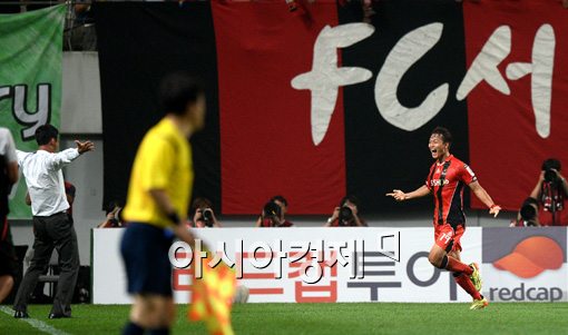[아시아경제 김현민 기자] 12일 서울 상암월드컵경기장에서 열린 프로축구 K리그 클래식 FC 서울과 수원 삼성의 경기에서 후반 종료 직전 서울 윤주태가 쐐기골을 성공시키고 최용수 감독을 향해 달려가고 있다. 김현민 기자 kimhyun81@asiae.co.kr<ⓒ세계를 보는 창 경제를 보는 눈, 아시아경제(www.asiae.co.kr) 무단전재 배포금지>