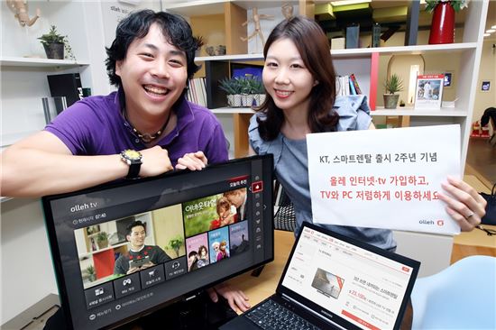 [아시아경제 김영식 기자]KT가 스마트렌탈 출시 2주년을 맞아 고객 혜택을 대폭 강화했다. 가입대상을 올레 tv 고객에서 인터넷 고객까지 확대하고 최신 제품을 구비했다.KT는 올레 인터넷과 올레 tv를 동시에 신규 가입하는 고객을 대상으로 스마트렌탈 TV와 PC를 최대 60% 할인된 수준에 구매할 수 있는 기회를 제공하고 가입대상도 확대했다고 13일 밝혔다. 스마트렌탈 서비스는 올레 tv의 신규·기존 이용 고객이 최신 LED TV와 PC 등을 월 7000원~3만원대의 저렴한 요금으로 할부 구매하여 사용하는 서비스다. 가입 대상 고객을 올레 인터넷 신규·기존 고객까지 확대하고, 삼성의 최신 UHD TV 등 다양한 제품 라인업을 추가했다. 또 렌탈 비용도 36개월 할부뿐만 아니라 즉납, 12개월, 24개월까지 가능케 해 고객 상황에 따라 선택의 폭을 넓혔다.올레 인터넷과 올레 tv를 동시 신규 가입한 고객은 삼성TV를 시중가 대비 최대 60% 저렴한 수준으로 구입할 수 있고, 강력한 PC 성능과 휴대성이 결합된 삼성 ‘ATIV 탭북’도 36개월 할부 기준 월 1만원대로 이용할 수 있다. 스마트렌탈은 최신 제품을 인터넷 최저가보다 저렴한 가격으로 이용할 수 있고 즉납 및 할부 구매가 가능하며 무상 A/S 제공으로 교체나 수리 걱정 없이 사용할 수 있어 많은 고객들의 호응을 얻을 것으로 기대된다.이필재 KT 마케팅부문 GiGA사업본부장은 “스마트렌탈에 대한 고객의 호응과 관심이 높아, 올레 인터넷과 올레 tv에 가입하면 TV와 PC를 파격적인 가격에 구입할 수 있도록 고객 혜택을 강화했다”며 “앞으로도 KT에서 통신뿐만 아니라 통신 관련 단말까지 저렴하게 구매할 수 있는 토탈서비스로 고객 감동을 실현하겠다”고 말했다. 상품 가입과 자세한 안내는 올레닷컴(www.olleh.com)과 전용 고객센터(1899-4164), 전국의 올레 플라자를 통해 확인할 수 있다.김영식 기자 grad@asiae.co.kr<ⓒ세계를 보는 창 경제를 보는 눈, 아시아경제(www.asiae.co.kr) 무단전재 배포금지>