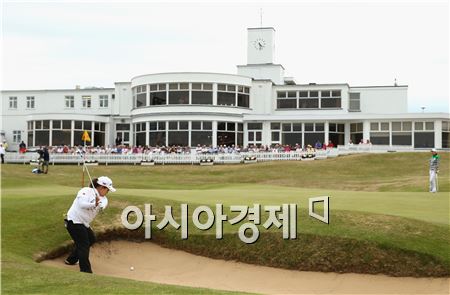 안선주가 브리티시여자오픈 셋째날 문제의 18번홀에서 벙커 샷을 하고 있는 장면이다. 사우스포트(잉글랜드)=Getty images/멀티비츠