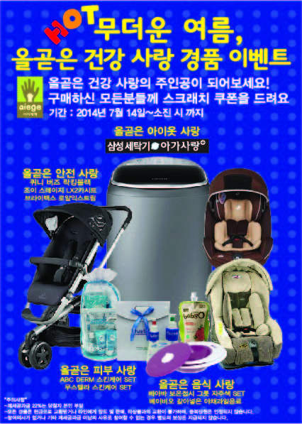 [아시아경제 임혜선 기자]보령메디앙스가 여름을 맞아 고객대상 경품 이벤트를 진행한다.이번 이벤트는 무더운 여름 건강한 육아제품 사용을 권장하고자 마련됐으며, 보령메디앙스가 운영하는 오프라인에서 동시에 진행된다. 참여는 오는 27일까지 전국 유아용품 프리미엄 전문숍 비비하우스와 키즈컬쳐센터 아이에게, 오가닉 토탈 라이프숍 디오가닉, 군포 드레인 매장 등 보령메디앙스의 유아용품 오프라인 매장을 찾아 구매금액 상관없이 제품을 구매하면, 세탁기와 유모차 등 다양한 경품이 담긴 스크래치 쿠폰을 받을 수 있다. 또한 동대문디자인플라자점(DDP) 아이에게 매장에서는 스페인 완구샵인 이츠이매지컬뿐만 아니라, 카페테리아 와 북카페 이용 고객까지 모두 참여 가능하다. 경품으로는 올곧은 아이 옷 사랑(1명)에 삼성전자 아가사랑 세탁기를, 올곧은 안전사랑(3명)에 퀴니 유모차와 브라이텍스, 조이카시트 등이 제공된다. 올곧은 피부사랑(9명)에는 스킨케어세트를 올곧은 음식사랑(6800명)에는 베아바 보온접시 세트와 ONO2 베이비오 주스 등을 준다. 당첨경품은 현장에서 바로 확인 후 수령 받을 수 있다. 단, 부피가 큰 일부 상품은 별도 배송된다. 임혜선 기자 lhsro@asiae.co.kr<ⓒ세계를 보는 창 경제를 보는 눈, 아시아경제(www.asiae.co.kr) 무단전재 배포금지>