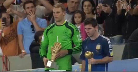 2014 브라질 월드컵에서 골든 글러브를 수상한 독일의 노이어(왼쪽)와 골든볼을 수상한 아르헨티나의 메시(사진: KBS 2TV 방송 캡처)
