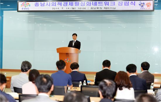 [아시아경제 왕성상 기자] ‘충남 사회적 경제 활성화 네트워크’가 닻을 올렸다.충남도는 14일 오후 4시 홍성군 내포에 있는 도청 대회의실에서 충남지역 공공기관, 시민단체 등 54개 단체 관계자 70여명이 참석한 가운데 ‘충남 사회적 경제 활성화 네트워크’ 창립식을 가졌다고 15일 밝혔다.충남도가 돕고 한국사회적기업진흥원, 충남시민재단이 주최한 이날 행사는 안희정 충남도지사, 김지철 충남도교육감, 김재구 한국사회적기업진흥원장 등이 참석해 힘을 실어줬다.창립식에 앞서 열린 총회에선 허승욱 충남도 정무부지사, 이윤기 충남사회경제네트워크 이사장, 이상선 충남시민재단 이사장이 공동대표로 뽑혔다.민·관 협의체인 ‘충남 사회적 경제 활성화 네트워크’는 시민사회를 바탕으로 한 자발적 참여를 통해 충남지역 경제 활성화를 위한 단체로 공공기관, 기업, 종교계, 비정부기구(NGO) 등 54곳이 동참했다.안희정 충남도지사가 '충남 사회적 경제 활성화 네트워크' 창립식에 참석, 축사를 하고 있다.