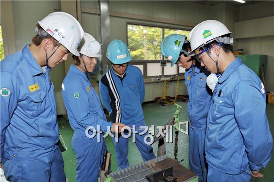"정비기술력 향상과 안전한 설비 정비작업 노하우 공유 ""입사 5년 미만 사원 참여, '용접, 중량물 이동, 센터링 작업' 등 3개 분야 " [아시아경제 김권일 기자]포스코 광양제철소(소장 백승관)가 외주파트너사 직원을 대상으로 '정비작업 기능경진대회'를 열고 정비기술력 향상과 정비작업 노하우를 공유하는 시간을 가졌다. 14일 광양제철소 기술교육센터에서 열린 이날 경진대회는 에프엠씨, (주)건우, 피엠에스 등 광양제철소 설비 정비 외주파트너사 11개사가 참여한 가운데 용접과 중량물이동, 센터링작업 등 3개 분야에 대해 랜덤으로 선발된 80여명의 입사 5년차 미만 직원들이 그 동안 현장에서 익혀 온 작업기술을 자랑했다.광양제철소(소장 백승관)가 외주파트너사 직원을 대상으로 '정비작업 기능경진대회'를 열고 정비기술력 향상과 정비작업 노하우를 공유하는 시간을 가졌다. <br />