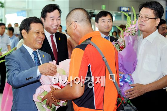 윤장현 광주광역시장은 16일 무안국제공항에서 열린 무안과 선양을 오가는 전세기 취항 환영식에 참석해 취항을 축하하고, 중국 관광객들에게 꽃다발을 전달했다. 사진제공=광주시<br />