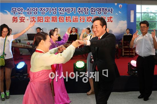 이낙연 전남도지사가 16일 무안국제공항에서 열린 무안과 중국 선양을 오가는 전세기 취항 환영식에 참석해 취항을 축하하고, 중국 관광객과 즐겁게 춤을 추면서 활짝웃고 있다. 사진제공=전남도