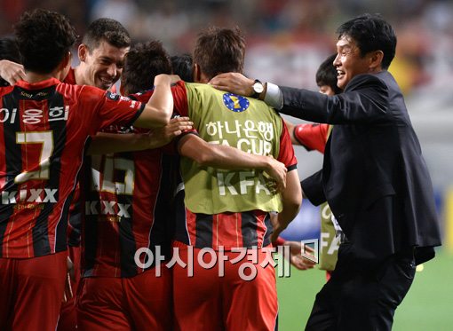[아시아경제 김현민 기자] 16일 서울 상암동 서울월드컵경기장에서 열린 2014 하나은행 FA컵 FC 서울과 포항 스틸러스의 16강전에서 승부차기까지 가는 접전(2-2, 승부차기 4-2) 끝에 승리를 거둔 서울 최용수 감독이 선수들과 기쁨을 나누고 있다. 김현민 기자 kimhyun81@asiae.co.kr<ⓒ세계를 보는 창 경제를 보는 눈, 아시아경제(www.asiae.co.kr) 무단전재 배포금지>