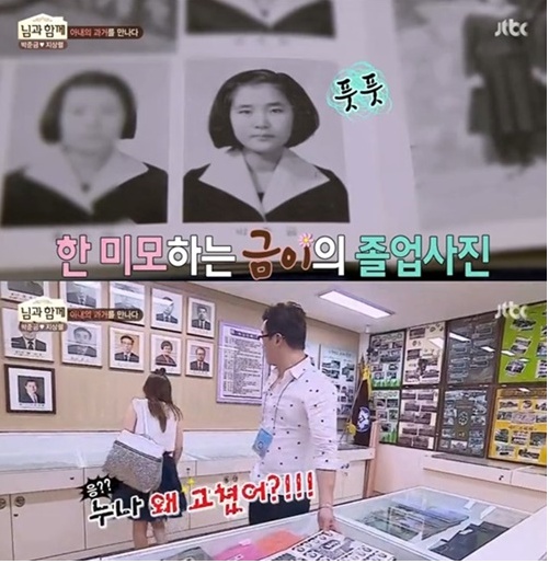 [아시아경제 온라인이슈팀] '님과함께' 박준금, 여고시절 사진공개에 지상렬 "누나 왜 고쳤어"'님과함께' 박준금의 여고시절 앨범 사진이 공개돼 눈길을 끈다.16일 방송된 종합편성채널 JTBC '님과 함께'에서는 가상 부부 박준금과 지상렬이 춘천으로 추억여행을 떠나는 모습이 그려졌다. 두 사람은 박준금의 모교인 '춘천여고'를 방문하여 박준금이 졸업 당시 찍었던 졸업앨범을 찾아보며 본격적인 추억여행을 시작했다.특히 남편 지상렬은 박준금의 여고시절 졸업사진을 보고는 입을 다물지 못하며 아름다웠던 미모에 입이 마르도록 칭찬을 아끼지 않았으면서도 "누나 왜 고쳤어"라고 돌직구를 날렸다. 이에 박준금은 "뭘 고쳐"라며 발끈한 모습을 보이며 폭소를 자아냈다.한편 '박준금'은 학교에 전시되어 있던 당시 교복을 입어보며 자신의 여고 시절을 회상하며 남편 지상렬과 함께 추억에 잠겼다.'님과함께' 박준금 여고시절 사진에 네티즌은 "님과함께 박준금, 소녀시절 정말 예뻤네" "님과함께 박준금, 세월의 흐름은 아무도 피해갈 수 없는 것이여" "님과함께 박준금, 살짝 고치면 어때"등의 반응을 보였다.온라인이슈팀 <ⓒ세계를 보는 창 경제를 보는 눈, 아시아경제(www.asiae.co.kr) 무단전재 배포금지>