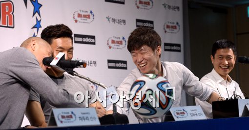 박지성(오른쪽 두 번째)이 K리그 올스타전 기자회견에서 환하게 웃고 있다. [사진=김현민 기자]