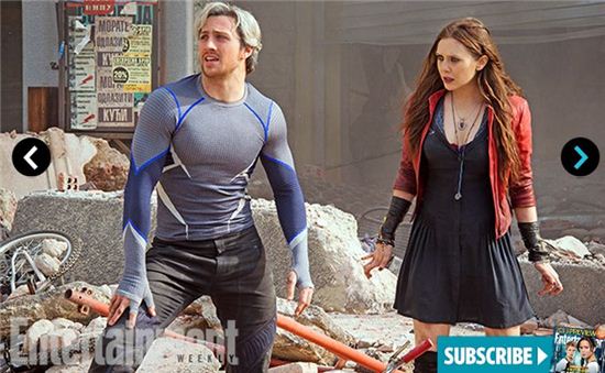 [아시아경제 온라인이슈팀] '어벤져스2' 아론 테일러 존슨의 퀵실버, '엑스맨' 퀵실버 다른 이유?어벤져스2의 스틸컷에서 '퀵실버'(아론 테일러 존슨)가 등장하면서 누리꾼의 관심이 폭증하고 있다.미국 매체 엔터테인먼트위클리는 16일(현지시간) '어벤져스2: 에이지 오브 울트론'의 스틸컷 8장을 공개했다. 사진에서는 배우들이 착용할 새 코스튬(의상)과 촬영 현장이 드러났다.공개된 사진에는 기존 어벤져스 구성원 외에 새로 등장하는 퀵실버와 '스칼렛 위치'(엘리자베스 올슨)의 모습이 담겼다.'엑스맨: 데이즈 오브 퓨처 패스트'의 퀵실버(왼쪽) (사진: 20세기폭스 제공)