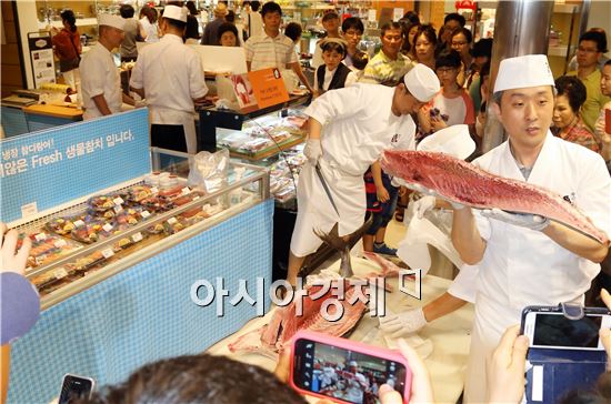 (주)광주신세계(대표이사 유신열) 지하 1층 신세계 푸드마켓에서 19일 무게 100kg대가 넘는 포르투갈산 참다랑어(참치) 해체 퍼포먼스가 열려 고객들에게 재미를 선사함은 물론 즉석에서 신선한 부위를 판매해 큰 호응을 얻었다. 사진제공=광주신세계<br />