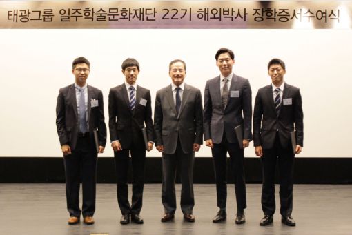 태광그룹 일주학술문화재단이 지난 18일 서울 종로구 흥국생명빌딩에서 개최한 해외박사 장학생 장학증서 수여식에서 심재혁 부회장(사진 왼쪽에서 3번째)이 22기 장학생 4명과 기념사진을 찍고 있다.