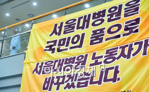 [아시아경제 백소아 기자] 의료민영화법 입법예고 기간이 만료되는 가운데 21일 서울 종로구 서울대병원 본관에서 서울대병원 노조원들이 의료민영화 저지 2차파업 출정식을 열고 있다.백소아 기자 sharp2046@asiae.co.kr<ⓒ세계를 보는 창 경제를 보는 눈, 아시아경제(www.asiae.co.kr) 무단전재 배포금지>