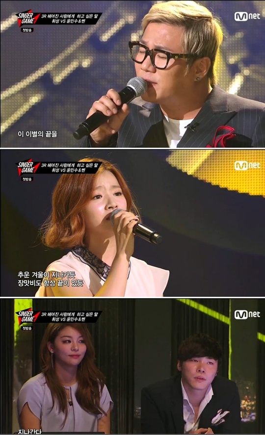 [아시아경제 온라인이슈팀] '싱어게임' 휘성, 눈물의 열창에도 우승 놓쳐'싱어게임' 1회 우승은 와이후 엔터테인먼트에 돌아갔다.23일 첫 방송된 Mnet ‘싱어게임’에서는 휘성과 윤민수가 각각 자신의 소속사 와이후와 YMC의 가수들과 함께 팀을 이뤄 맞대결을 펼쳤다.이날 방송에서 윤민수와 휘성은 ‘헤어진 사람에게 하고 싶은 말’이라는 주제로 노래를 선곡해 3라운드에서 대결했다. 판정단이 '이별 1년 미만의 사람들' 이라 이별한 사람들의 마음을 움직여야 높은 점수를 받을 수 있었다.휘성은 이소라의 ‘기억해줘’를 선곡해 무대에 올랐다. 이소라 특유의 짙은 감성이 특징인 이 노래로 무대에 오른 휘성은 호소력 짙은 목소리로 이소라 특유의 감성적인 가사를 완벽히 소화했다. 윤민수는 '지나간다'를 부르며 특유의 폭풍가창력을 뽐냈다. 특히 휘성은 노래를 마친 후 눈물을 흘려 주목을 받았고, 휘성의 짙은 감성에 방청객들 역시 눈물을 흘렸다. 그러나 휘성은 윤민수와의 대결에서 52대 48로 아쉽게 패해 첫 회 우승은 와이후 엔터테인먼트에게 돌아갔다.한편 ‘싱어게임’은 국내 최고 레이블의 보컬리스트들이 1대 1로 노래 대결을 펼치는 보컬 배틀 프로그램이다.온라인이슈팀 <ⓒ세계를 보는 창 경제를 보는 눈, 아시아경제(www.asiae.co.kr) 무단전재 배포금지>