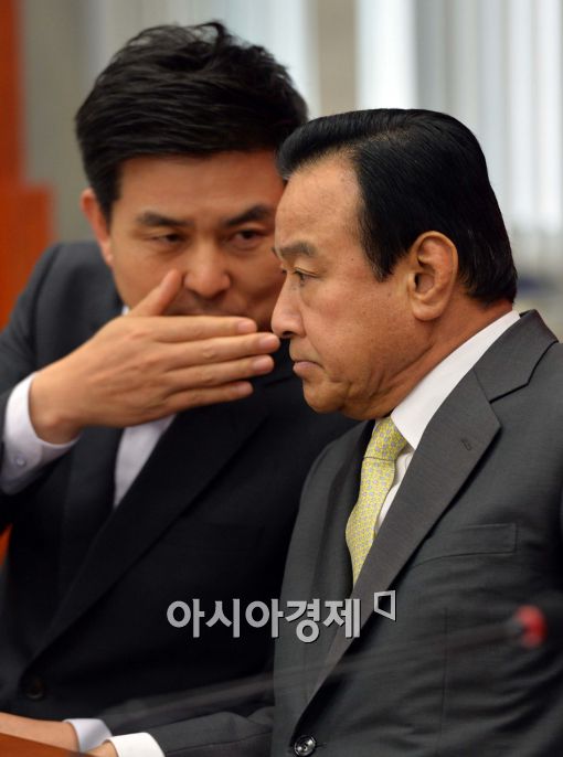 [아시아경제 최우창 기자] 새누리당 김태호 최고위원과 이완구 원내대표가 24일 국회에서 열린 최고위원회의에 참석, 잠시 대화를 나누고 있다.최우창 기자 smicer@asiae.co.kr<ⓒ세계를 보는 창 경제를 보는 눈, 아시아경제(www.asiae.co.kr) 무단전재 배포금지>