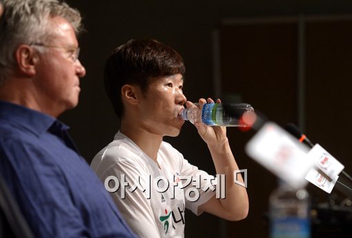 [아시아경제 김현민 기자] 프로축구 별들의 잔치인 'K리그 올스타전 with 팀 박지성' 경기를 하루 앞둔 24일 서울월드컵경기장 인터뷰실에서 열린 공식 기자회견에서 박지성이 물을 마시고 있다. 김현민 기자 kimhyun81@asiae.co.kr<ⓒ세계를 보는 창 경제를 보는 눈, 아시아경제(www.asiae.co.kr) 무단전재 배포금지>