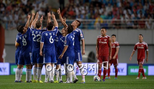 [아시아경제 김현민 기자]프로축구 별들의 잔치 'K리그 올스타전 with 팀 박지성' 경기가 25일 서울월드컵경기장에서 열렸다. K리그 올스타 선수들이 골 세리머니를 하고 있다. 김현민 기자 kimhyun81@asiae.co.kr<ⓒ세계를 보는 창 경제를 보는 눈, 아시아경제(www.asiae.co.kr) 무단전재 배포금지>