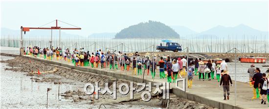 장흥군(군수 김성)은 26일 대덕읍 신리 앞바다 갯벌에서 2014년 개막이 체험행사를 가졌다.<br /> <br /> 이날 참석한 관광객들이 맨손으로 물고기잡기와 참꼬막 캐기 등 갯벌 체험행사를 하면서 무더위를 식혔다. <br /> <br /> 군은 오는 8월 9일 12시부터 제2차 개막이 체험행사를 진행할 계획이다.<br /> <br /> 올해로 12회째를 맞은 개막이[barrier] 체험은 조석 간만의 차가 큰 바다의 갯벌위에 그물을 쳐 놓은 후 밀물 때 바닷물을 따라 들어온 물고기 떼를 썰물 때 그물에 갇히도록 해 잡는 전통 고기잡이 방법이다.<br /> <br /> 특히 이곳은 오염되지 않은 바다와 갯벌에서만 서식하는 잘피가 집단으로 서식하는 곳으로 청정해역의 살아 숨 쉬는 갯벌위에서 펼쳐지는 물고기와의 숨바꼭질은 폭염과 스트레스에 지친 관광객들에게 특별한 체험과 추억을 선사하고 있다. 사진제공=장흥군 박진석 씨