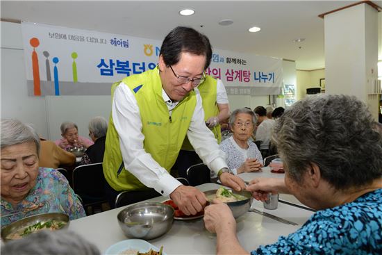 김학현 농협손해보험 대표이사(왼쪽 두 번째)가 28일 중복을 맞아 헤아림봉사단 40여명과 함께 노인복지시설을 방문해 삼계탕을 제공하며 봉사활동을 하고 있다.