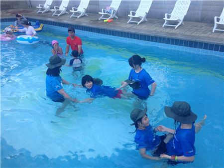 지난 24~25일 강원도 속초의 한 워터파크에서 열린 '여덟 빛깔 무지개 캠프'에 참여한 장애·비장애 청소년 70여명이 물놀이를 하고 있다.<br />