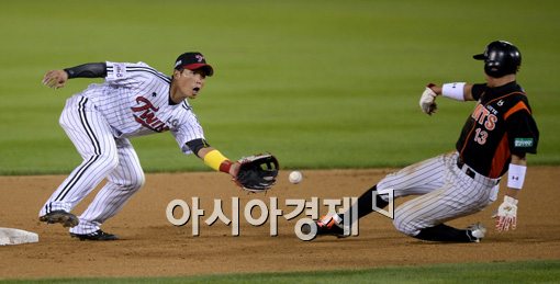 [아시아경제 김현민 기자] 28일 서울 잠실구장에서 열린 프로야구 롯데 자이언츠와 LG 트윈스의 경기, LG 2루수 박경수가 6회초 2사 1루 롯데 황재균 타석때 2루 도루를 시도한 1루주자 황재균을 태그아웃시키고 있다. 김현민 기자 kimhyun81@asiae.co.kr<ⓒ세계를 보는 창 경제를 보는 눈, 아시아경제(www.asiae.co.kr) 무단전재 배포금지>