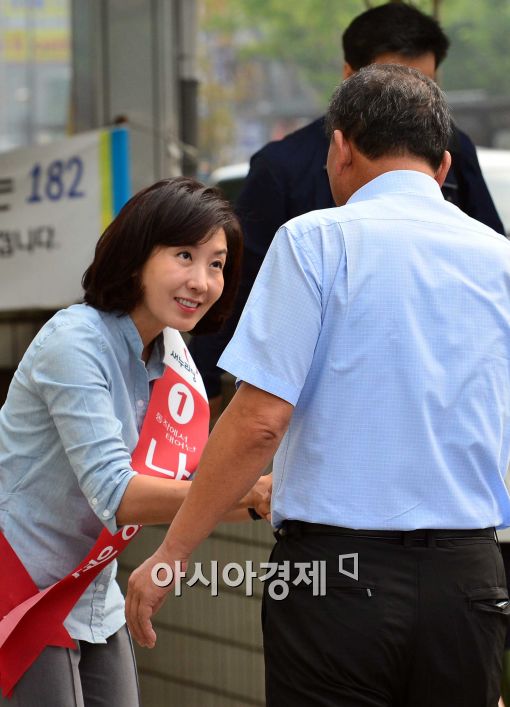 [아시아경제 최우창 기자]7·30 재보궐 선거를 하루 앞둔 29일 서울 동작을에 출마한 나경원 새누리당 후보가 서울 동작구 태평백화점 인근에서 출근길 인사를 하며 지지를 호소하고 있다. 최우창 기자 smicer@asiae.co.kr<ⓒ세계를 보는 창 경제를 보는 눈, 아시아경제(www.asiae.co.kr) 무단전재 배포금지>